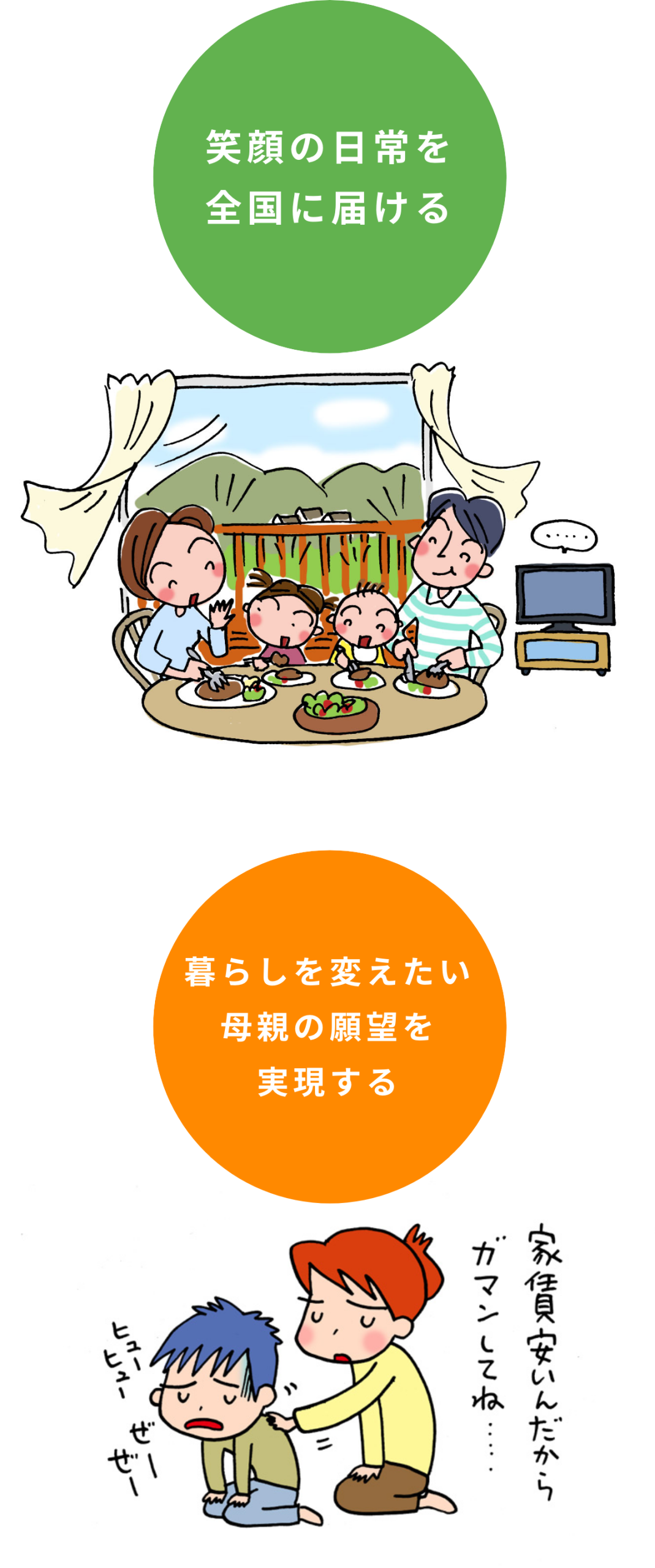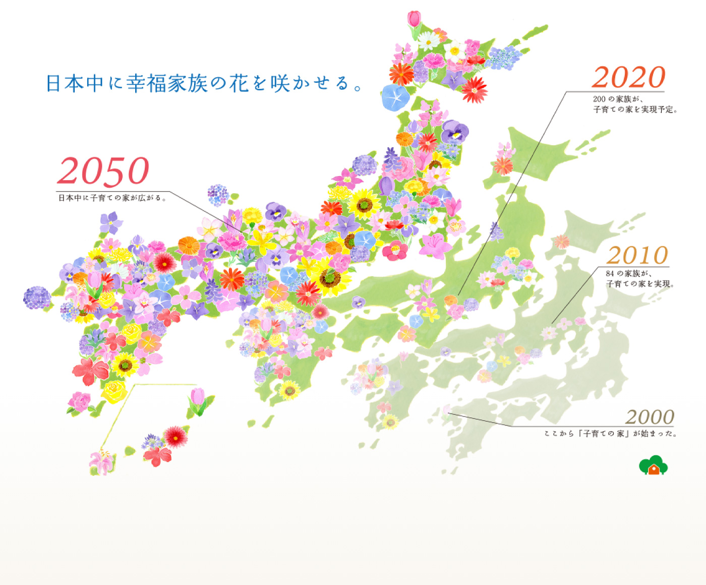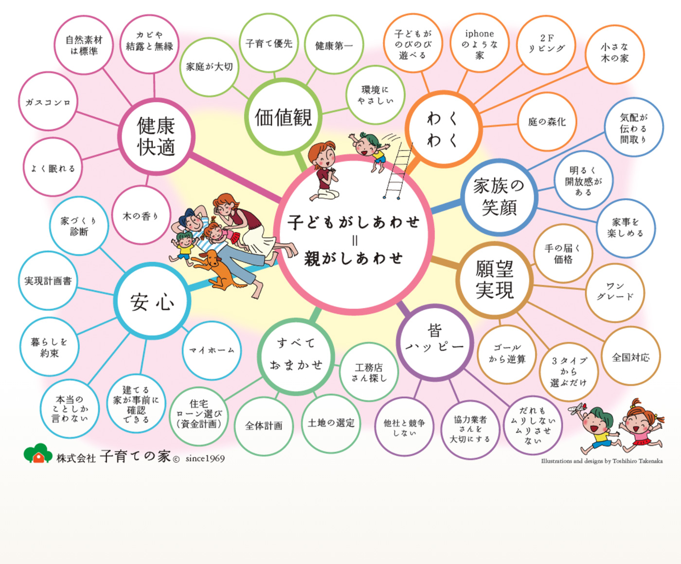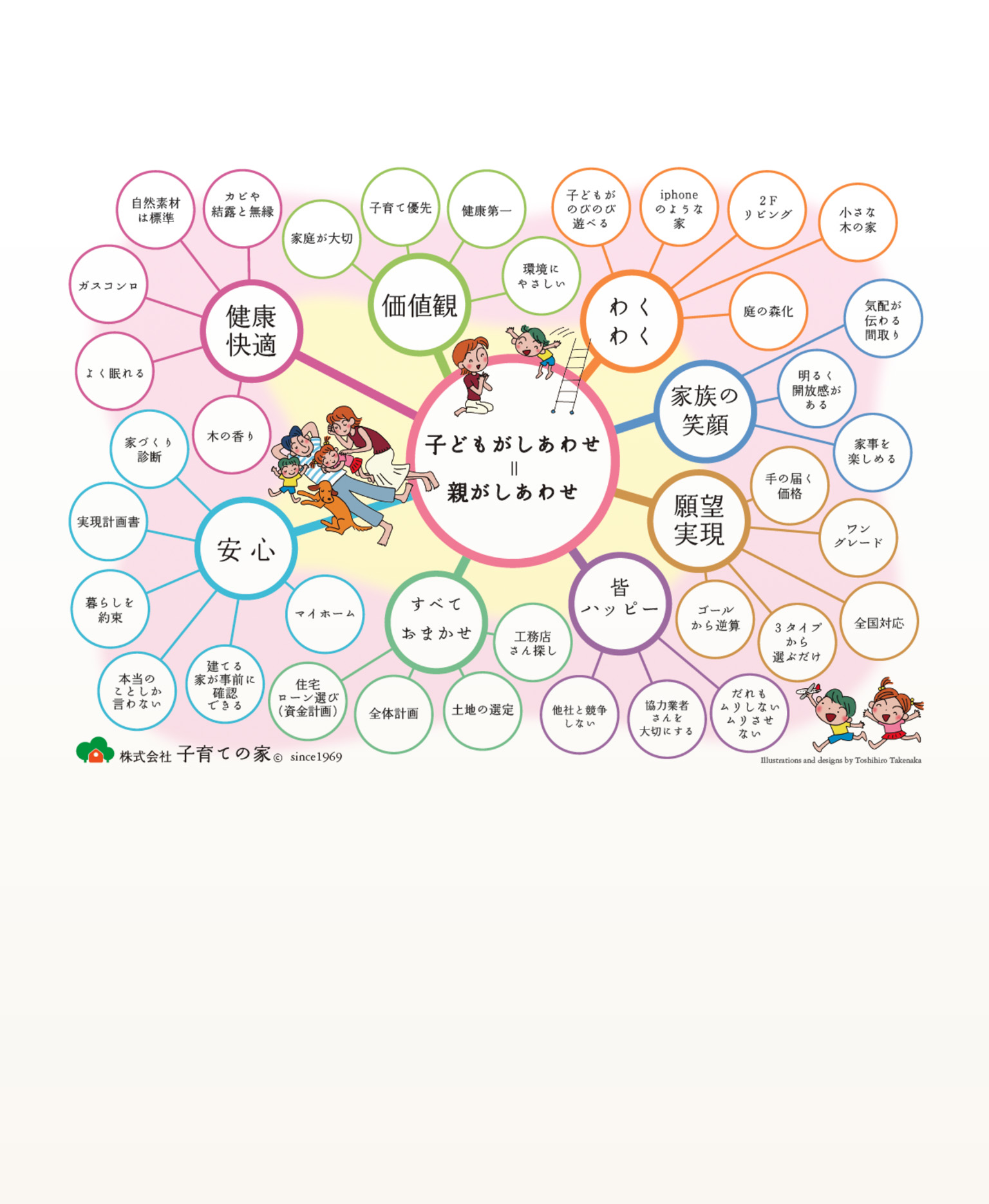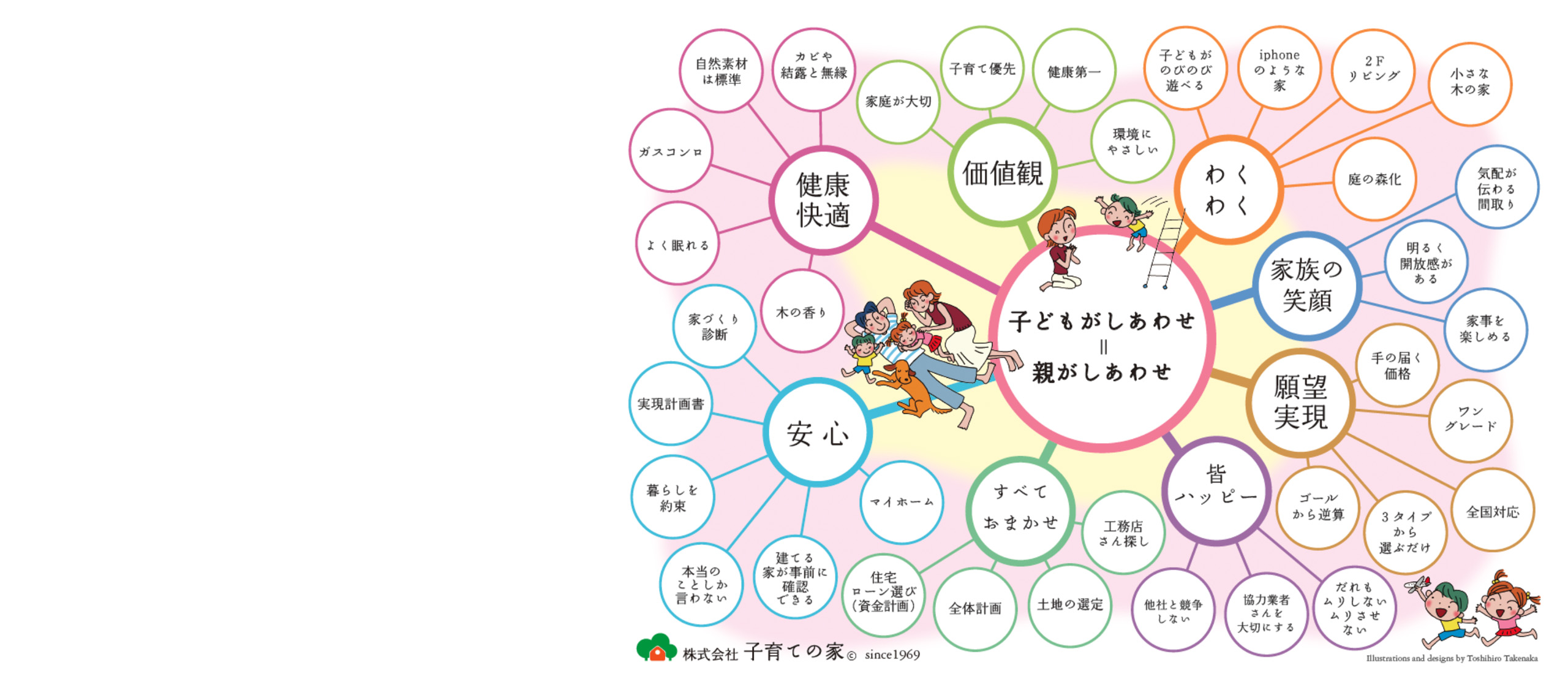 私たち『子育ての家』は「子育ては住まいから」という信念で家族の心身の健康と子どもがのびのび暮らせる、子育て優先の家づくりでお客様ご家族の幸せな人生に貢献する会社です。